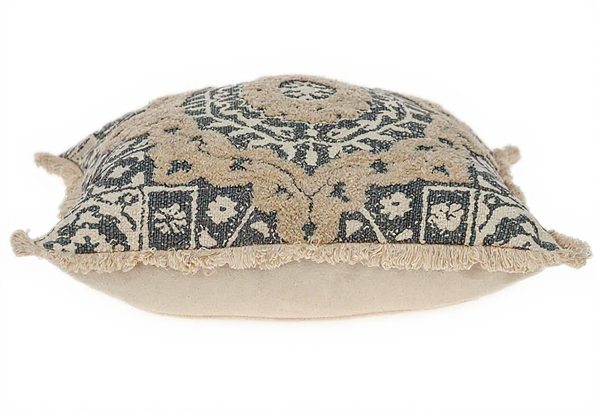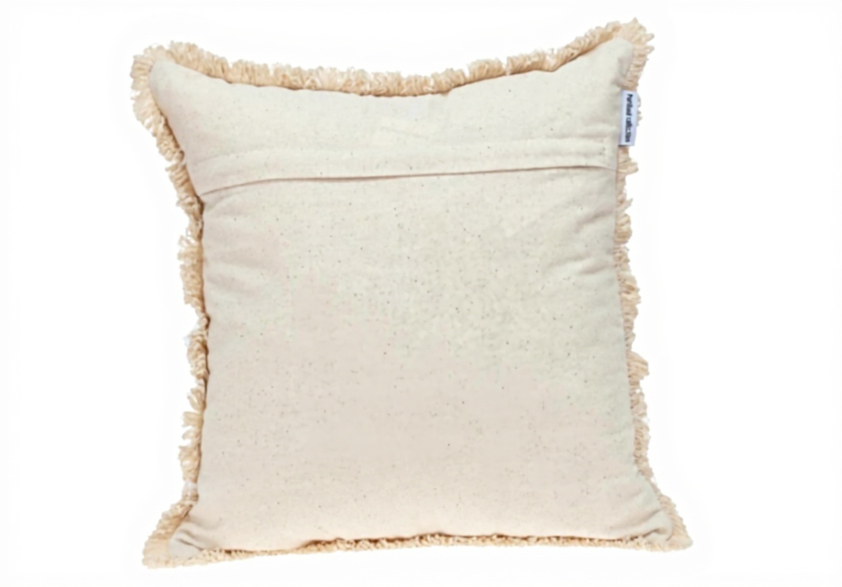 Ce coussin décoratif se distingue par son impression ethnique raffinée et sa broderie détaillée, agrémentée de courtes franges sur le pourtour. Fabriqué en 100% coton, il offre un entretien facile avec un lavage en machine possible. La fermeture éclair dissimulée à l’arrière permet un retrait aisé de la housse.