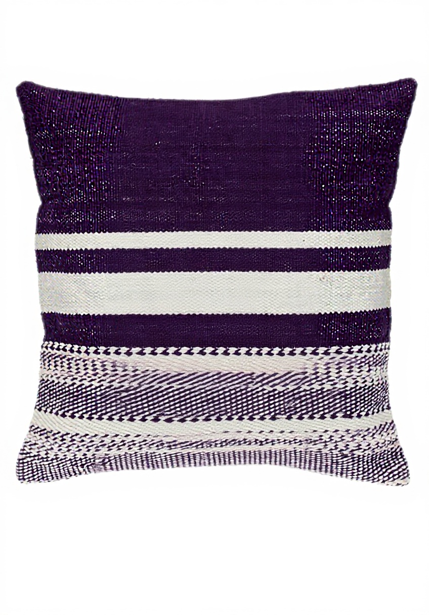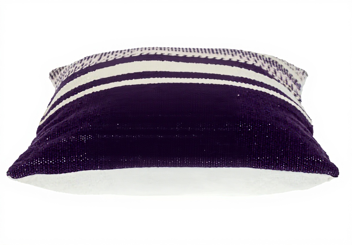 This bohemian-inspired pillow showcases a textured, multicolor design in purple with neutral beige stripes, crafted from durable polyester fabric. It includes a removable cover for effortless cleaning and is filled with soft polyester, ensuring long-lasting comfort and style in any room.