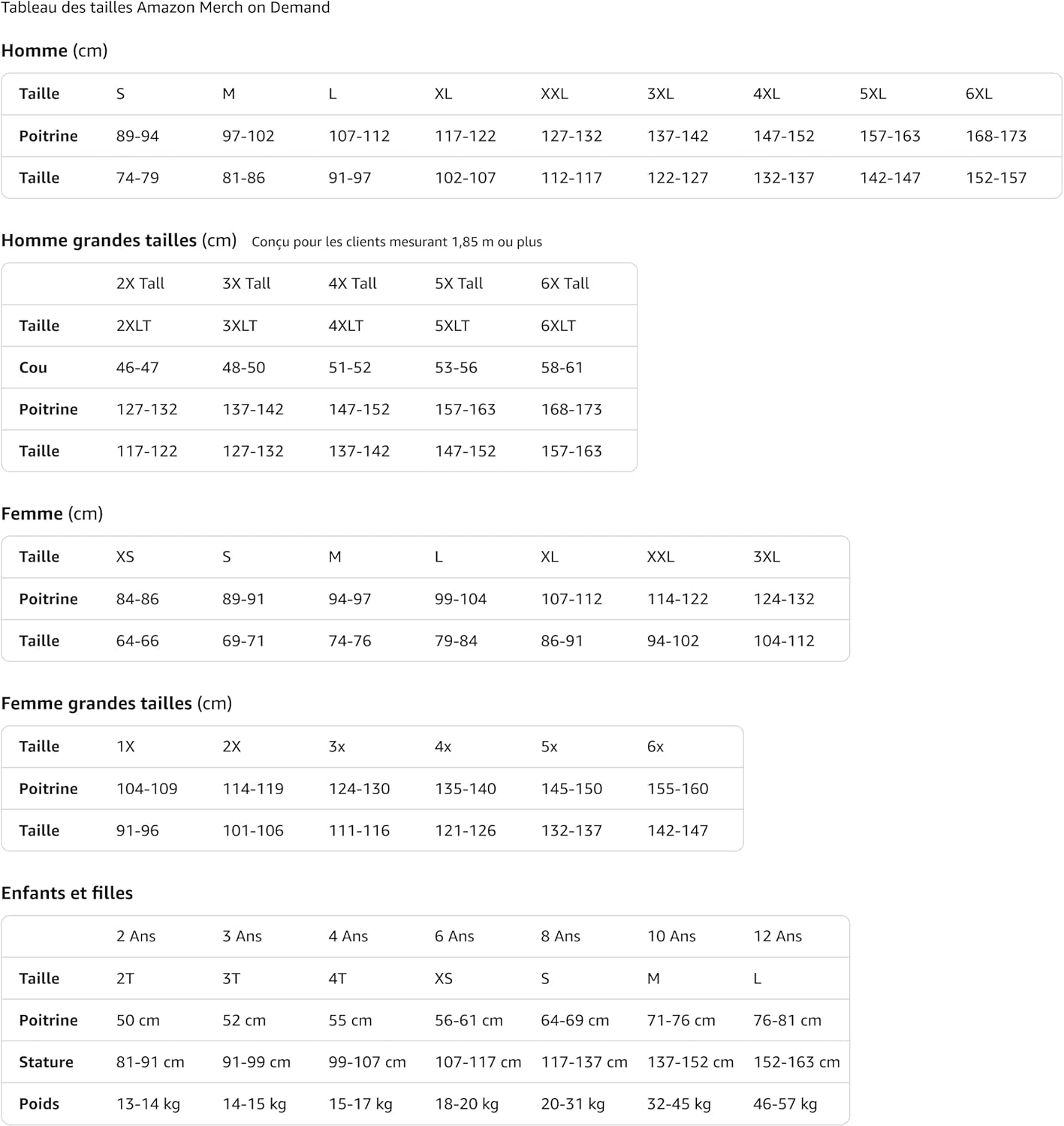 Quelles sont les tailles disponibles pour les enfants ?